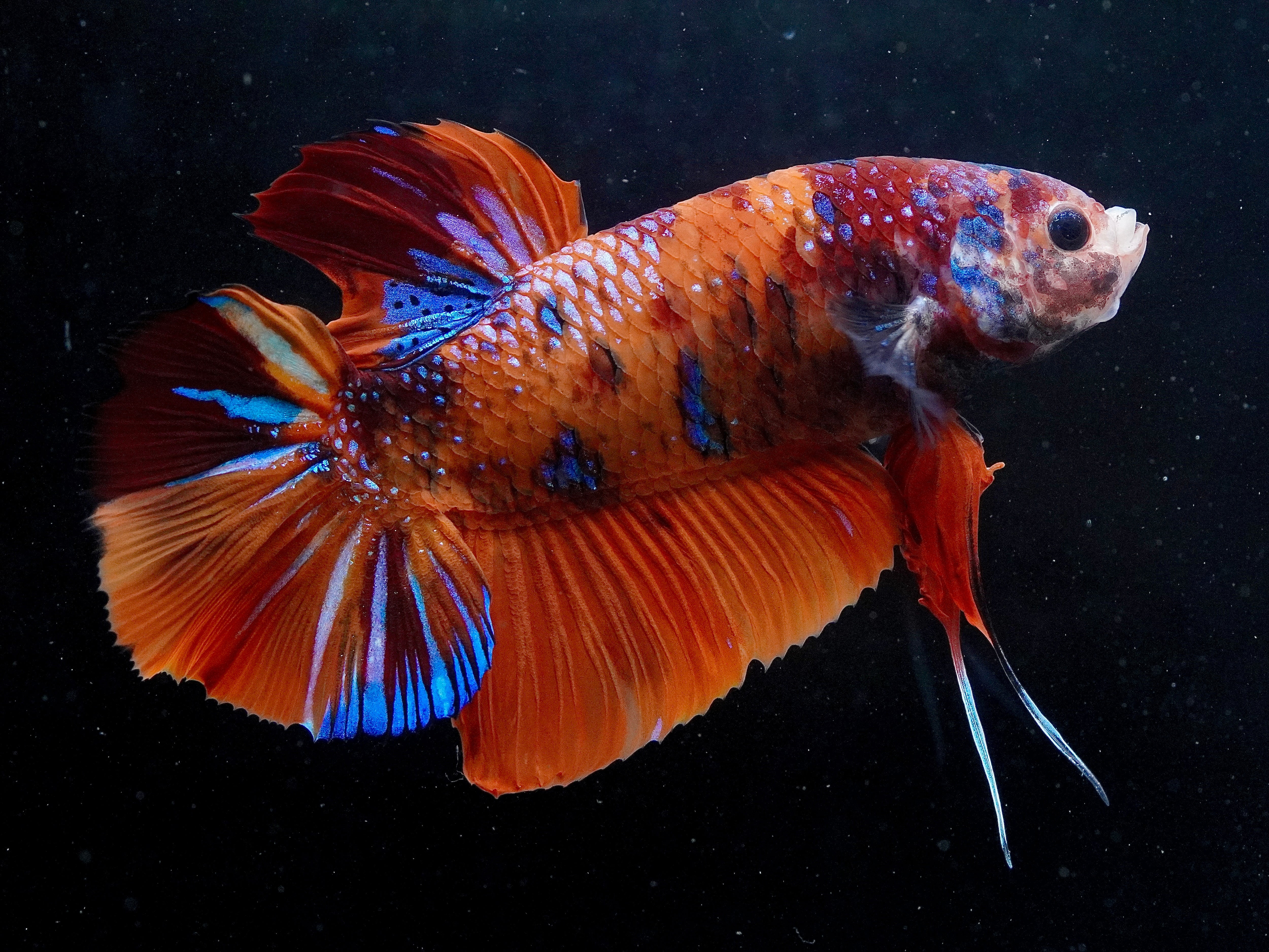 This betta is beautiful and healthy. They always come packed safely in a cooler in a fish bag with O2. They come and never seem stressed. I have gone with other sellers and the service and interaction isn't the same. I will get all my fish throught Houston Aqua!
