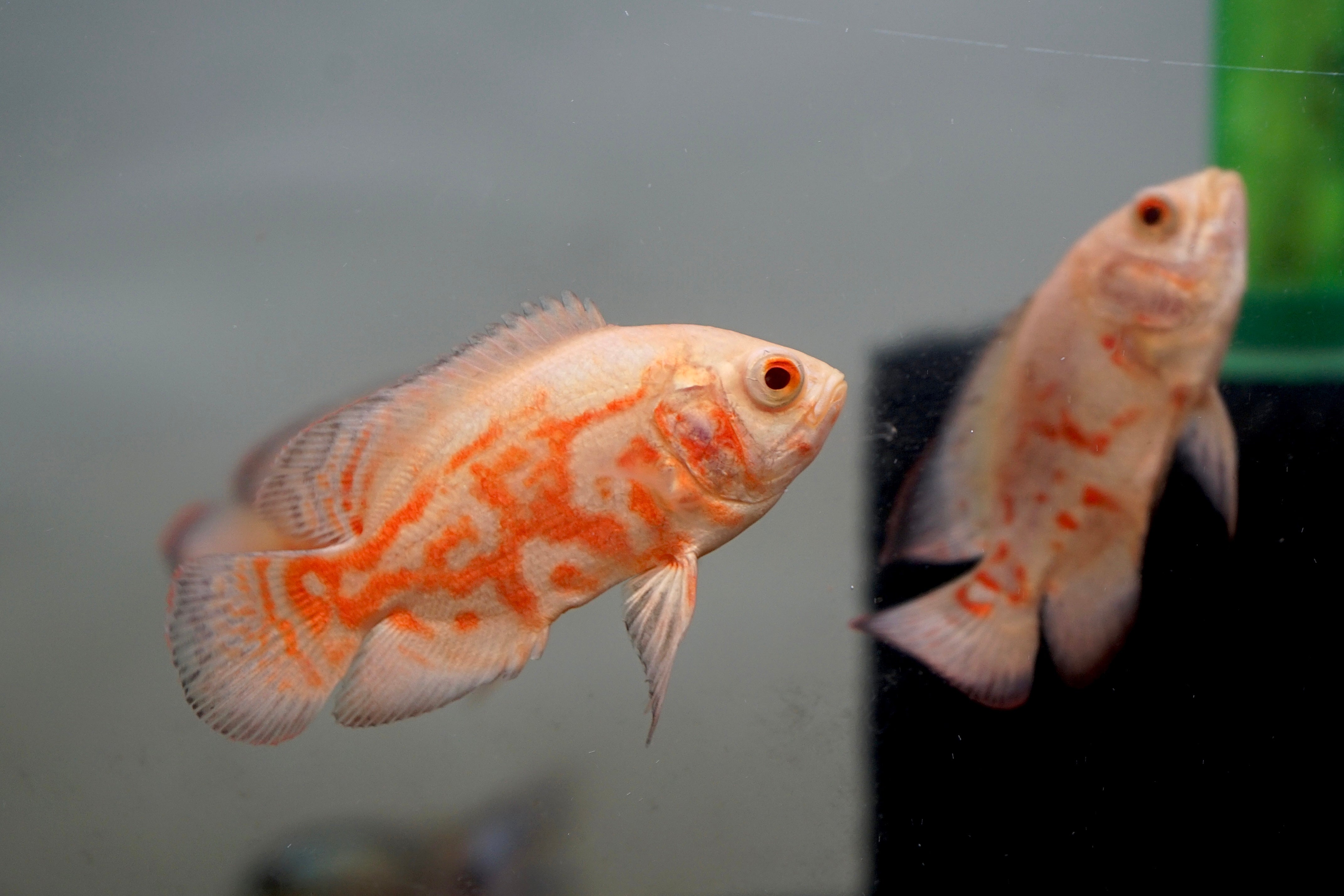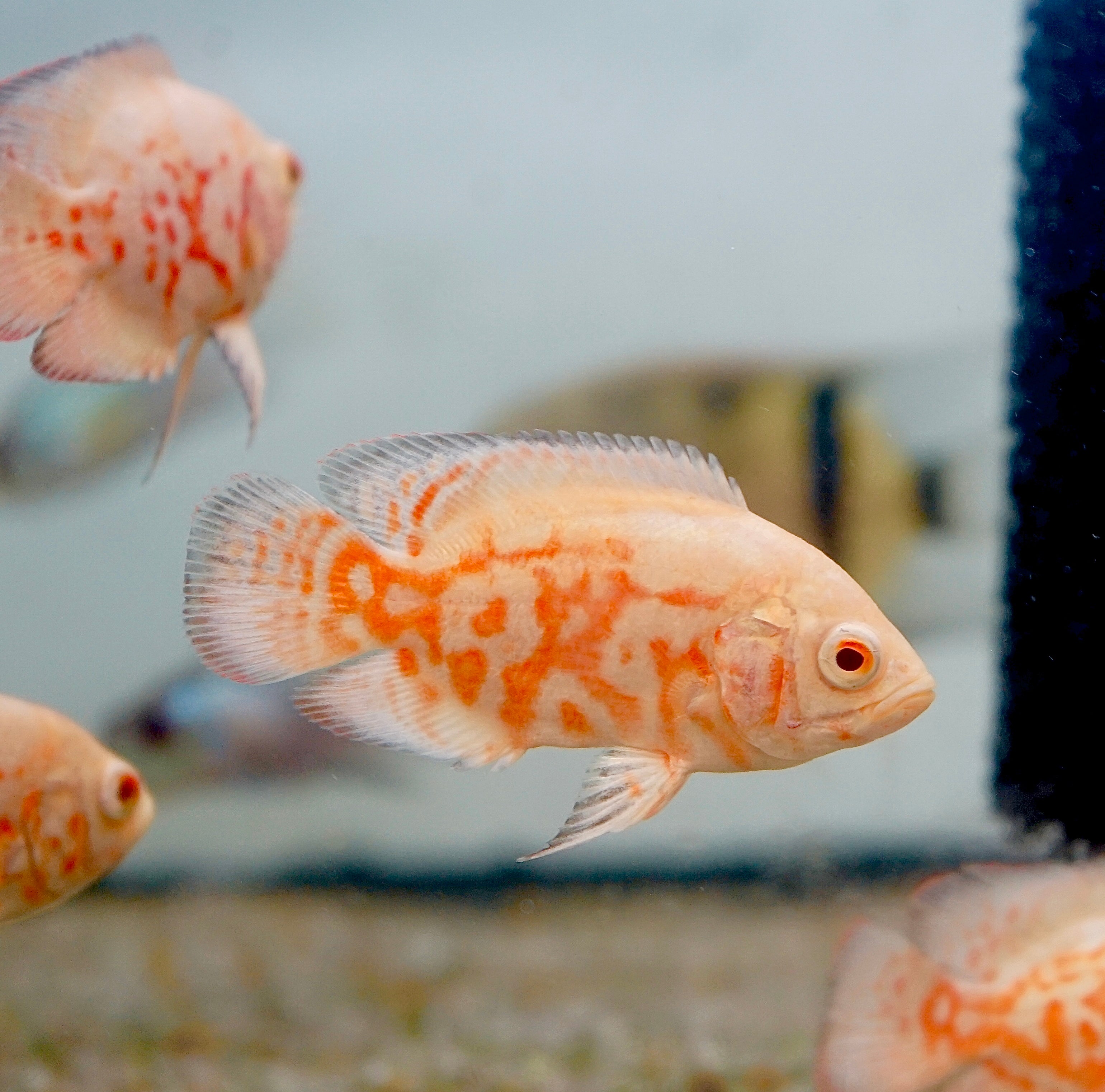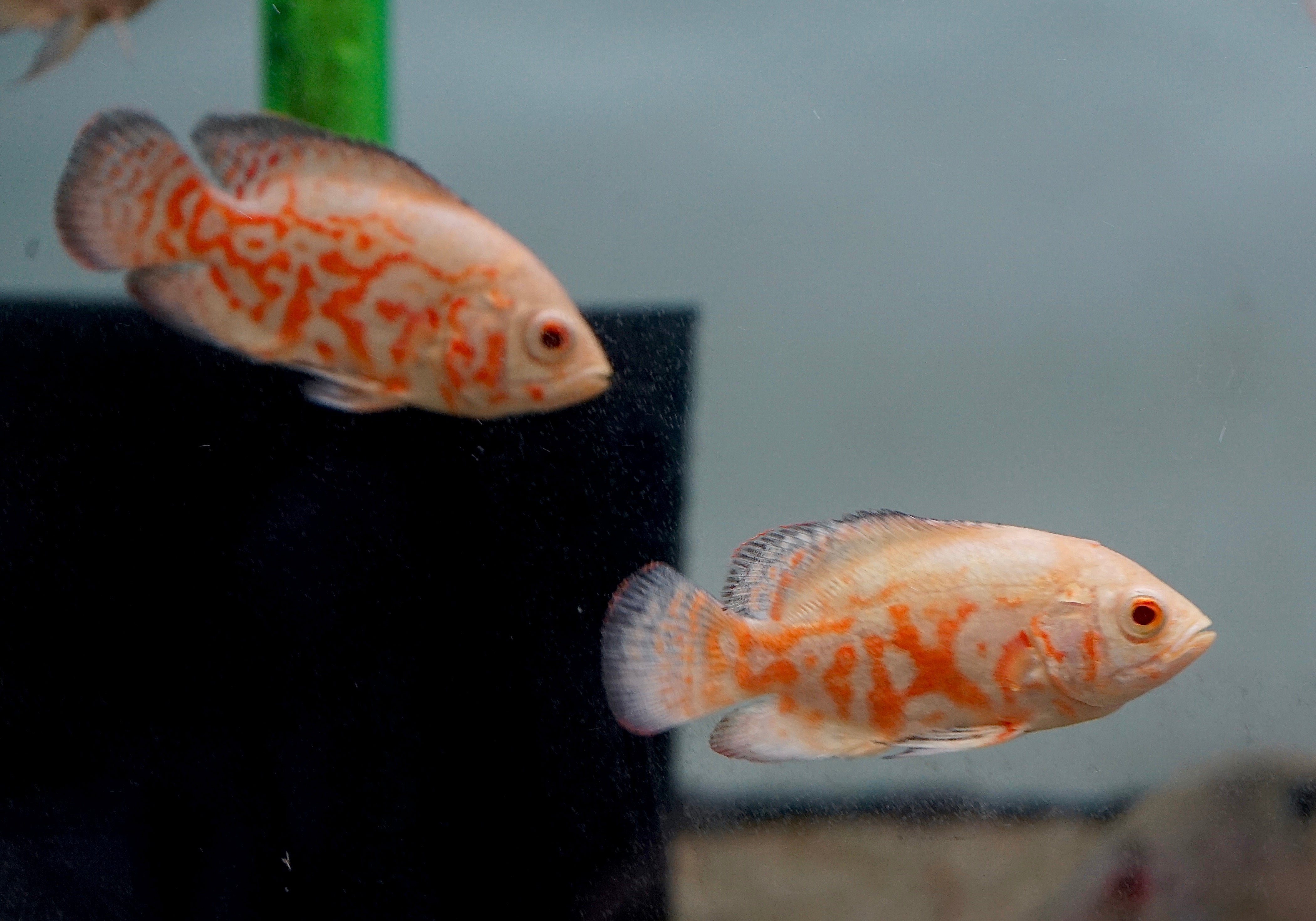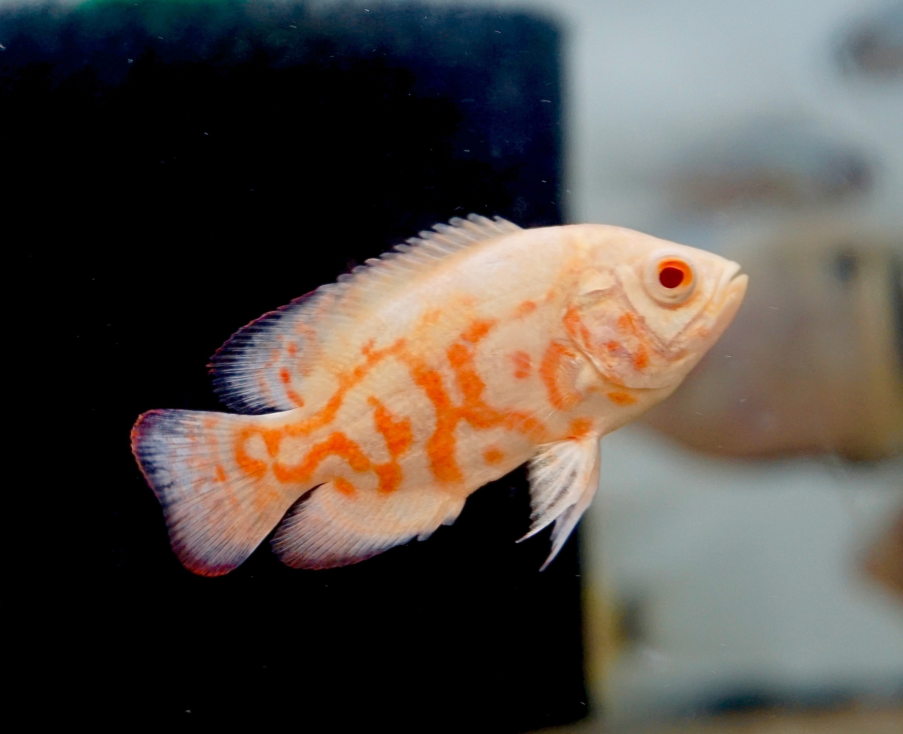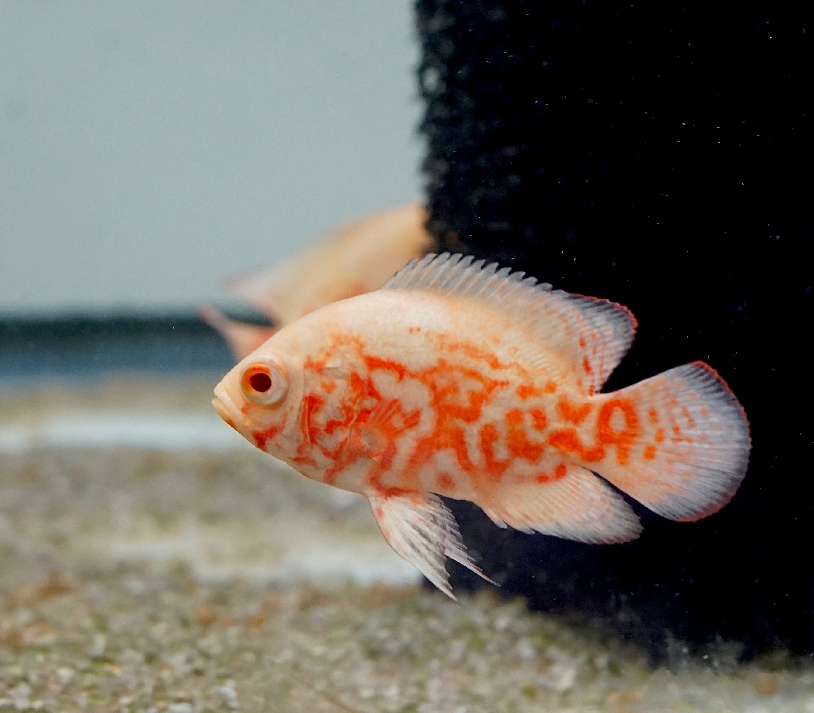 The Albino Fire Red Tiger Oscar showcases a vibrant red and white coloration that instantly draws attention. These intelligent and bold fish thrive in large aquariums of 75 gallons or more. Oscars are known for their unique personality and can coexist with larger tankmates like Plecos and cichlids. A must-have centerpiece for advanced aquarists.