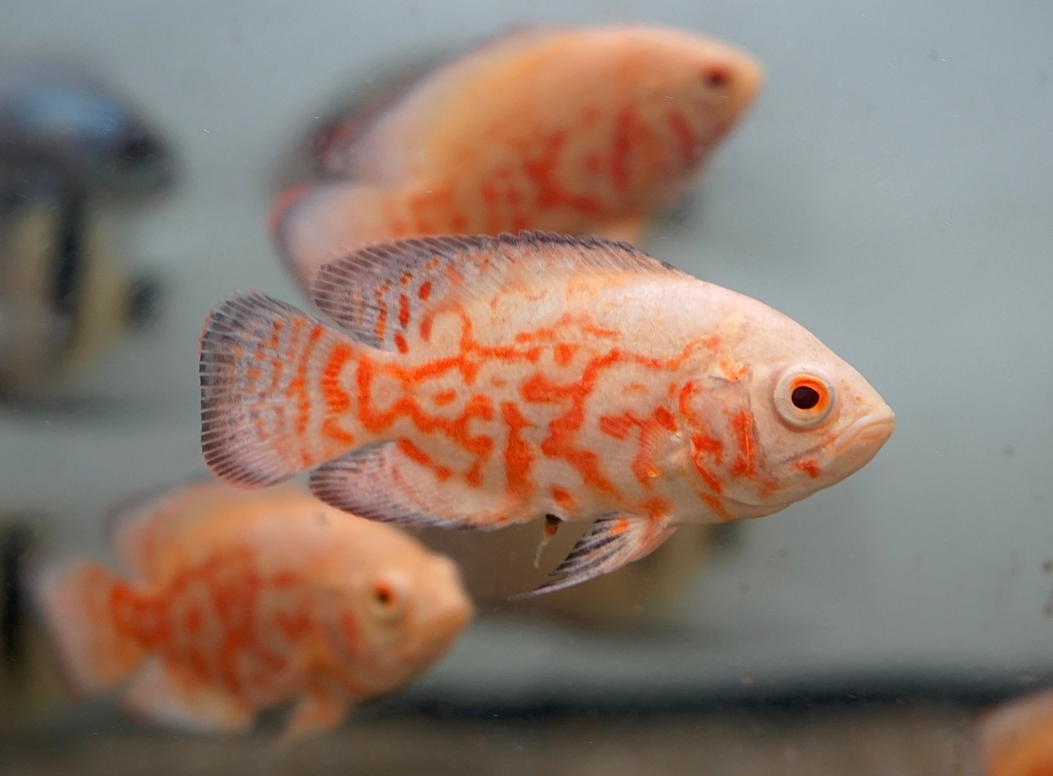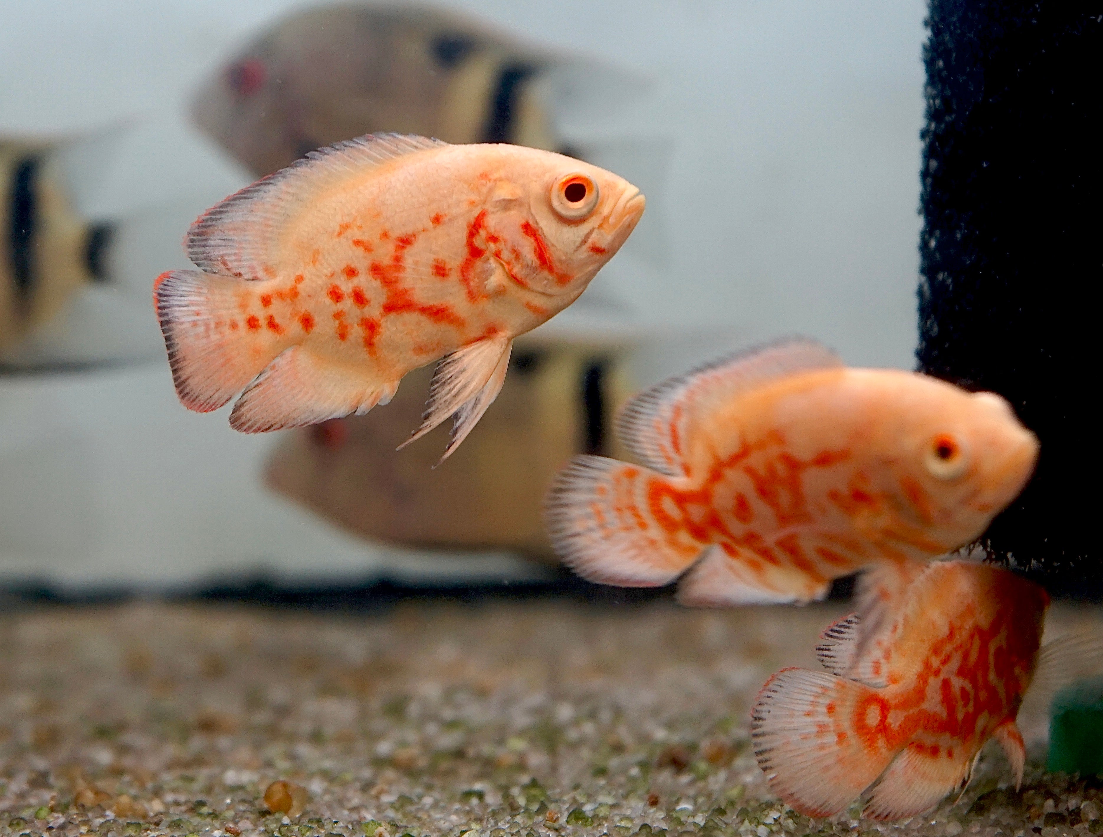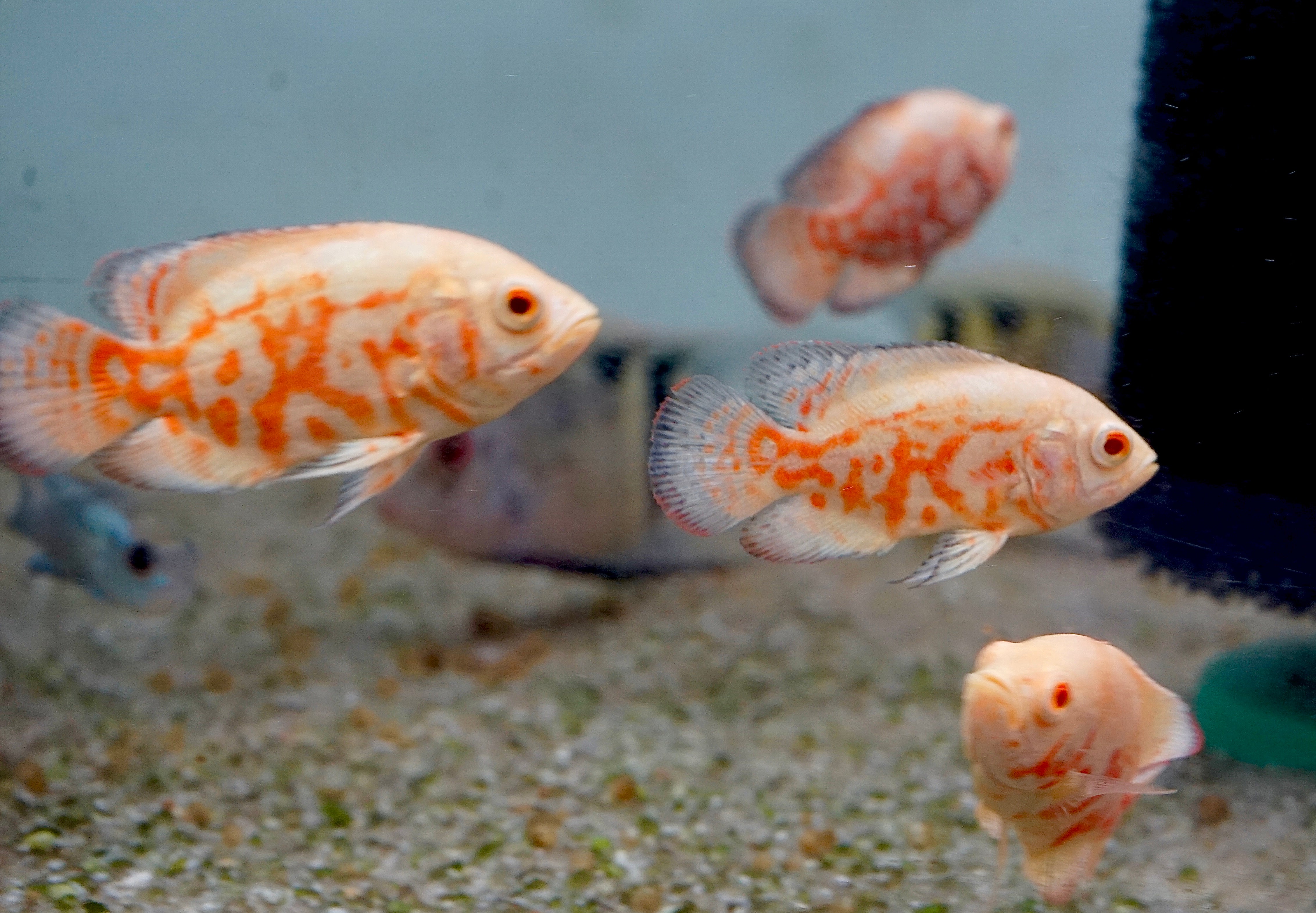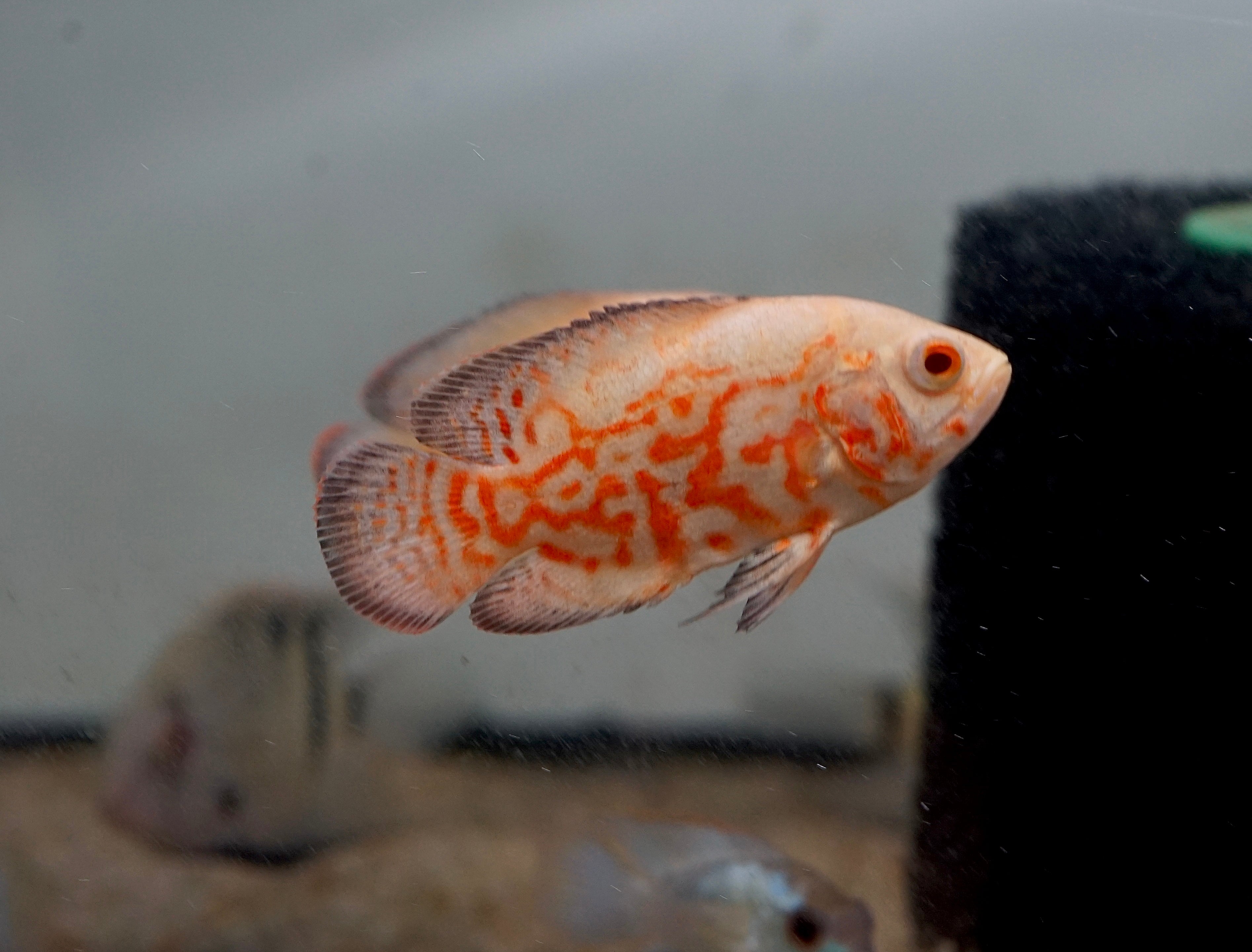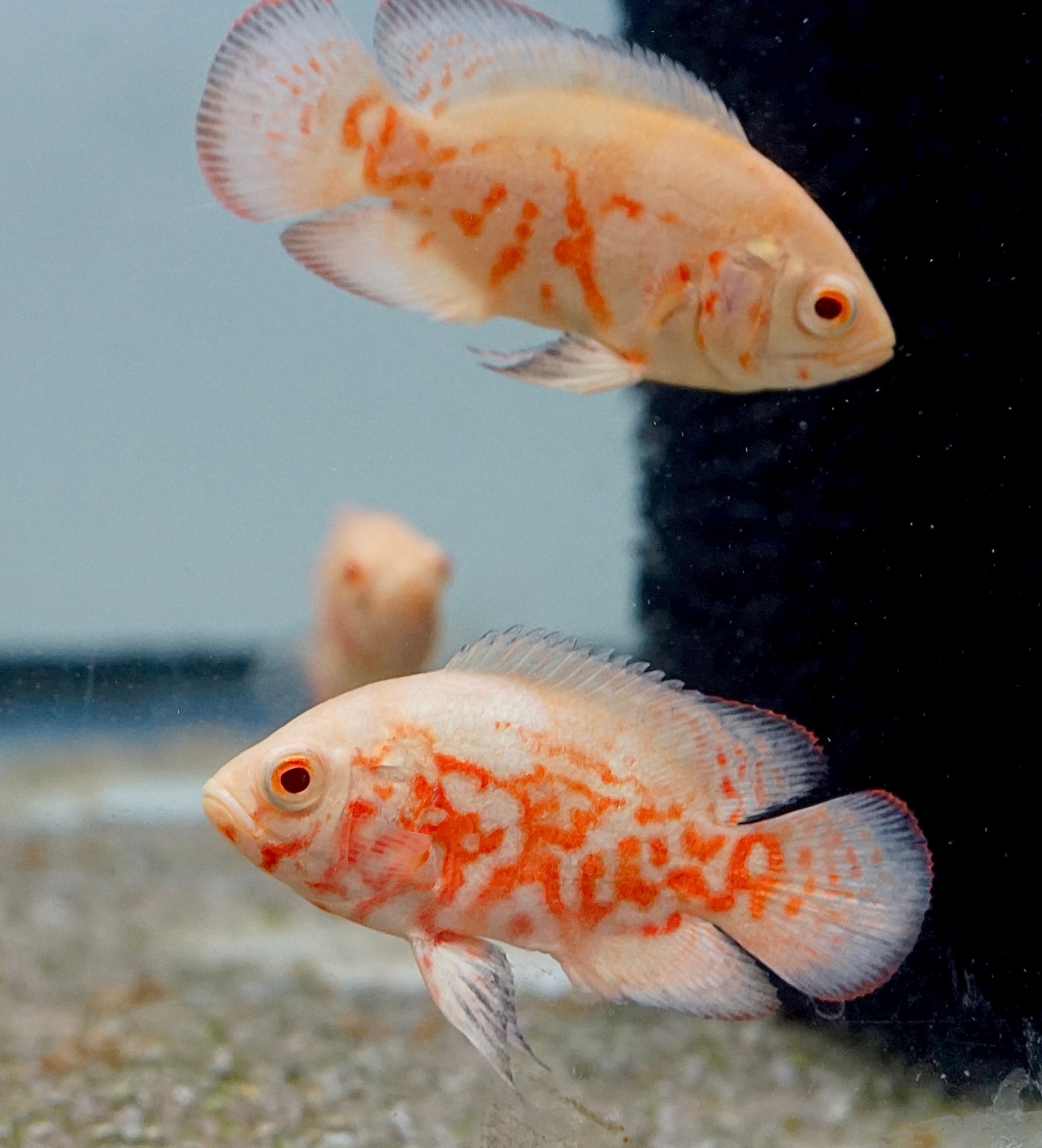 The Albino Fire Red Tiger Oscar showcases a vibrant red and white coloration that instantly draws attention. These intelligent and bold fish thrive in large aquariums of 75 gallons or more. Oscars are known for their unique personality and can coexist with larger tankmates like Plecos and cichlids. A must-have centerpiece for advanced aquarists.