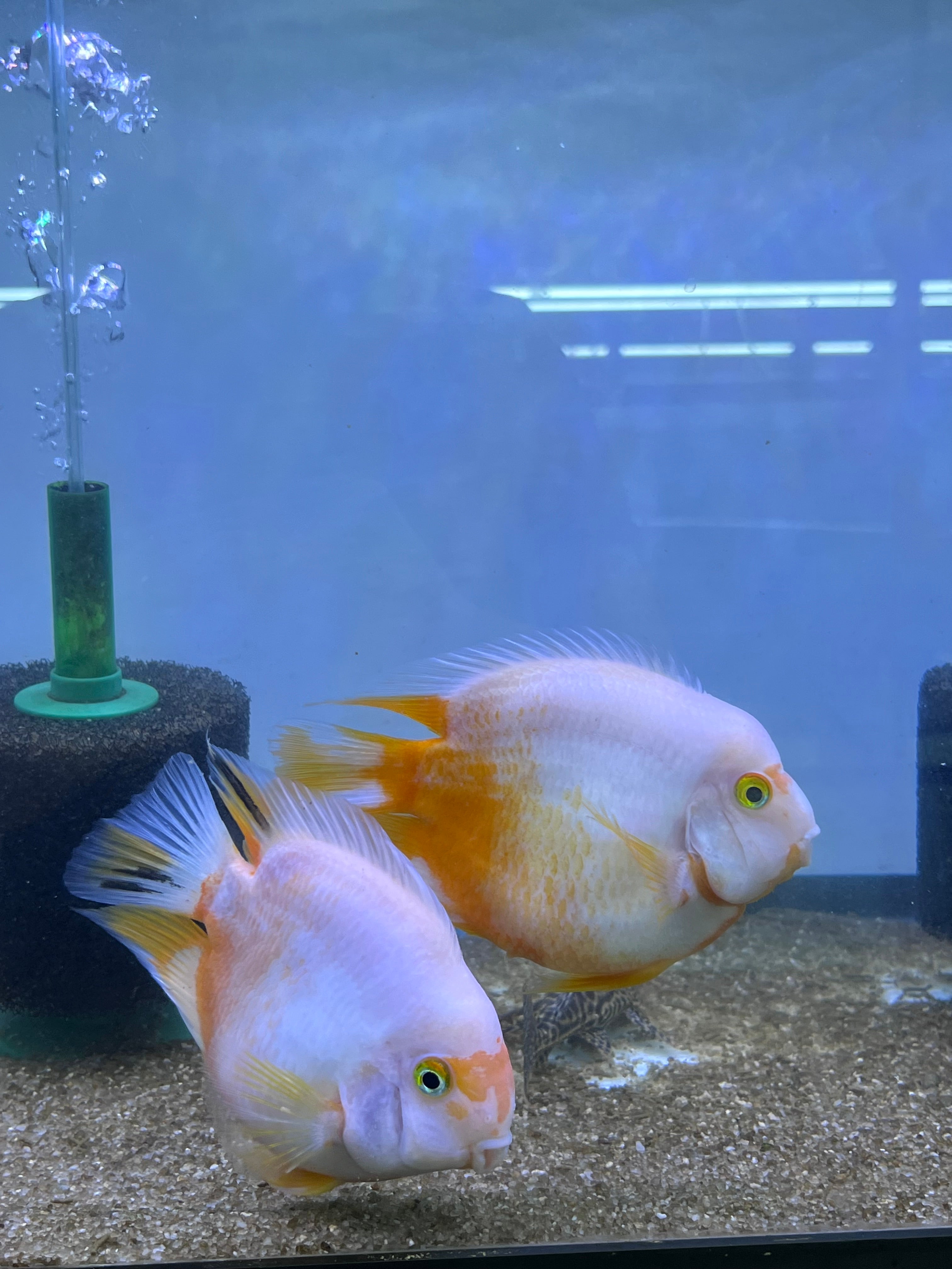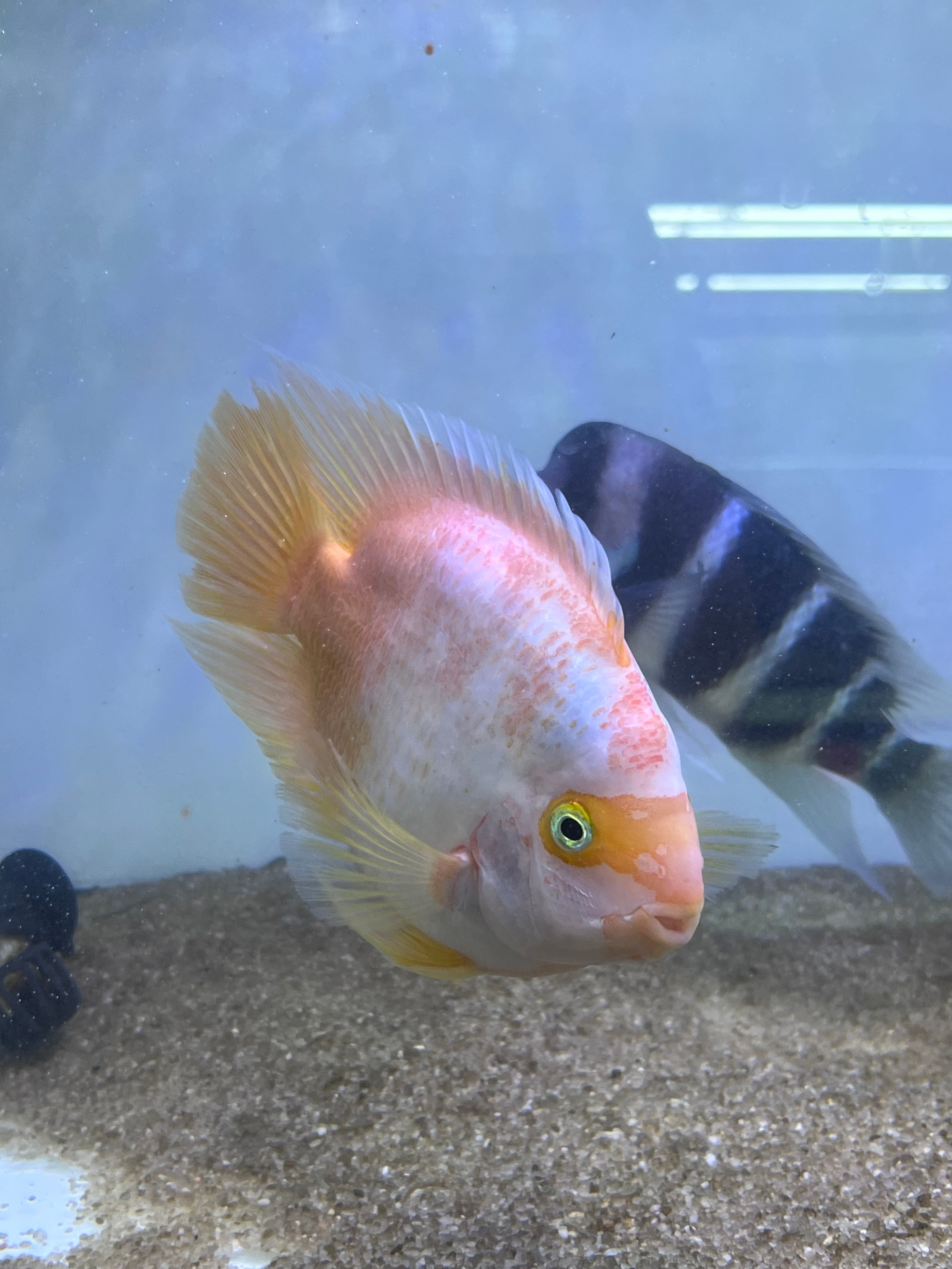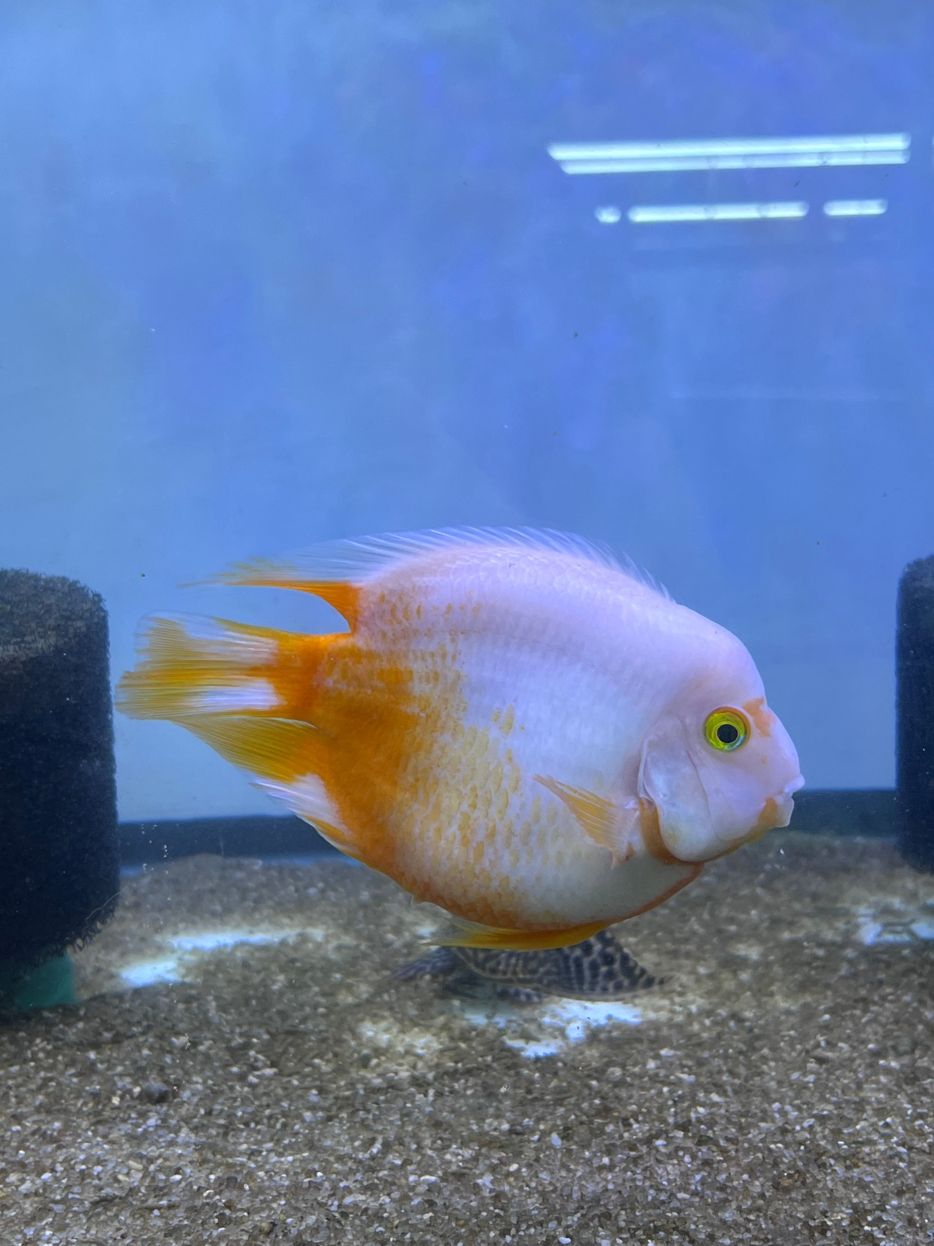 The Rare Golden Koi Parrot Fish (Panda) captivates with its unique white and yellow patterns. A hybrid cichlid, it thrives in tanks of 55 gallons or more. Known for its peaceful temperament, it pairs well with other community cichlids, creating a harmonious and colorful tank.