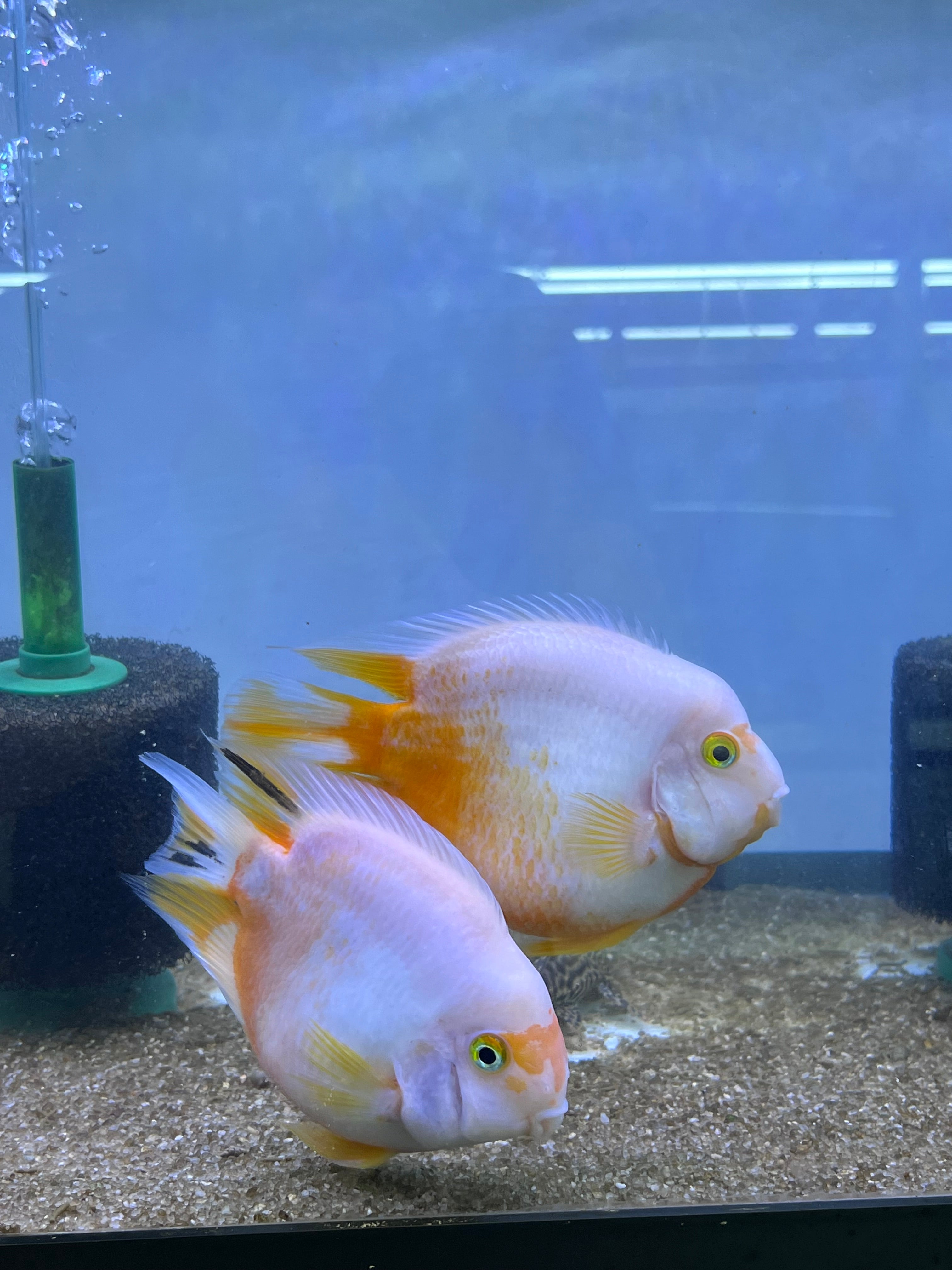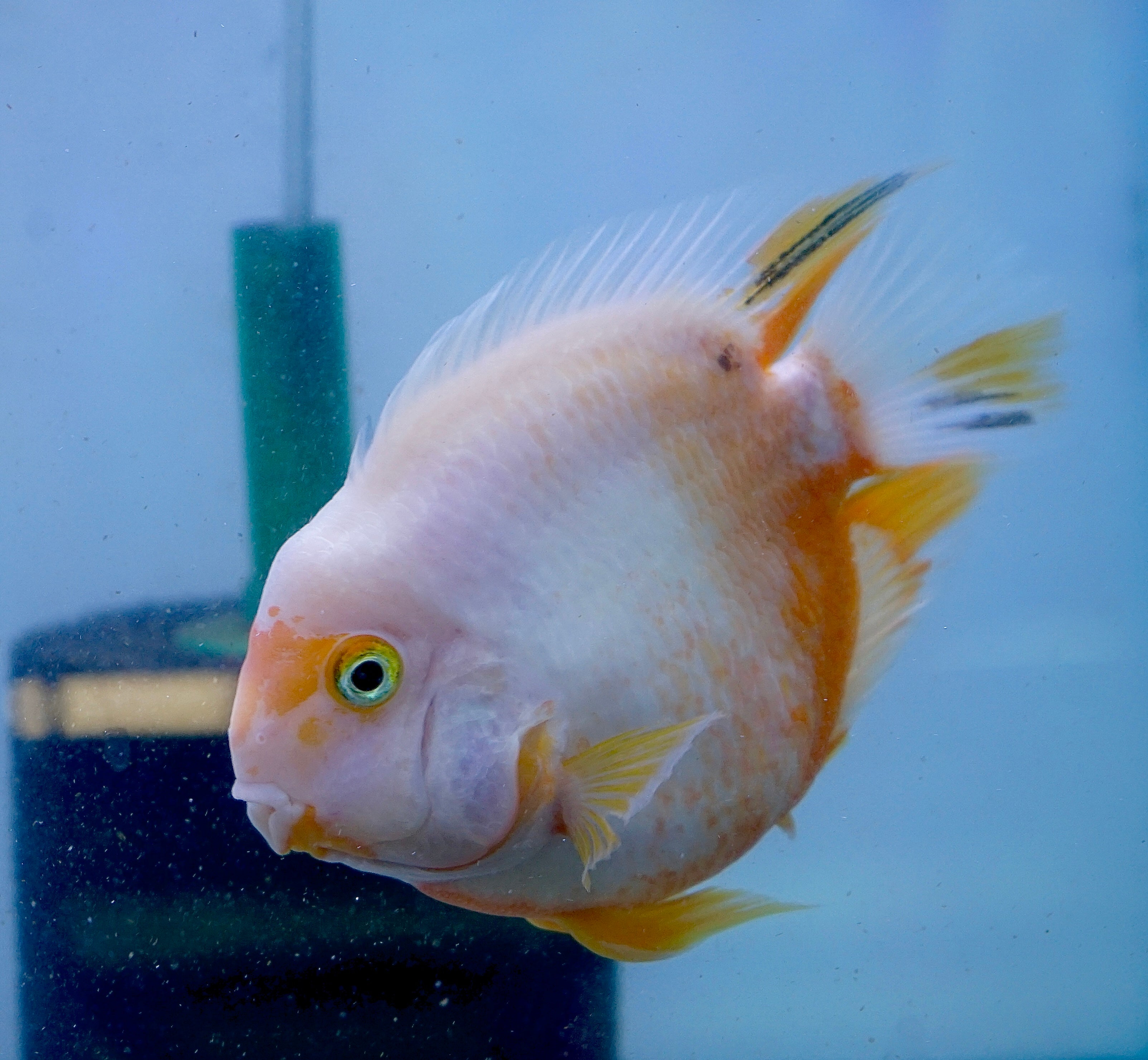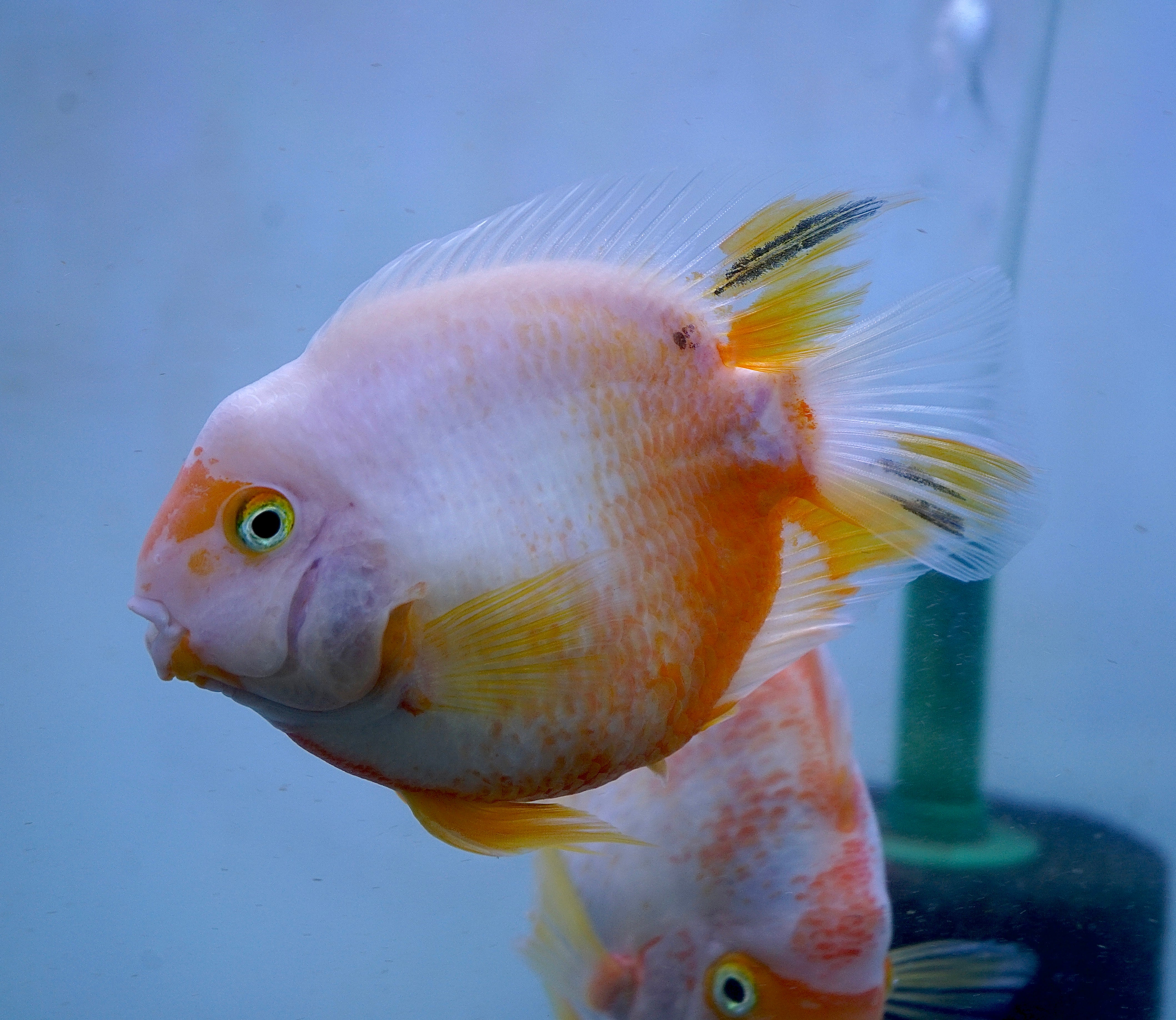 The Rare Golden Koi Parrot Fish (Panda) captivates with its unique white and yellow patterns. A hybrid cichlid, it thrives in tanks of 55 gallons or more. Known for its peaceful temperament, it pairs well with other community cichlids, creating a harmonious and colorful tank.