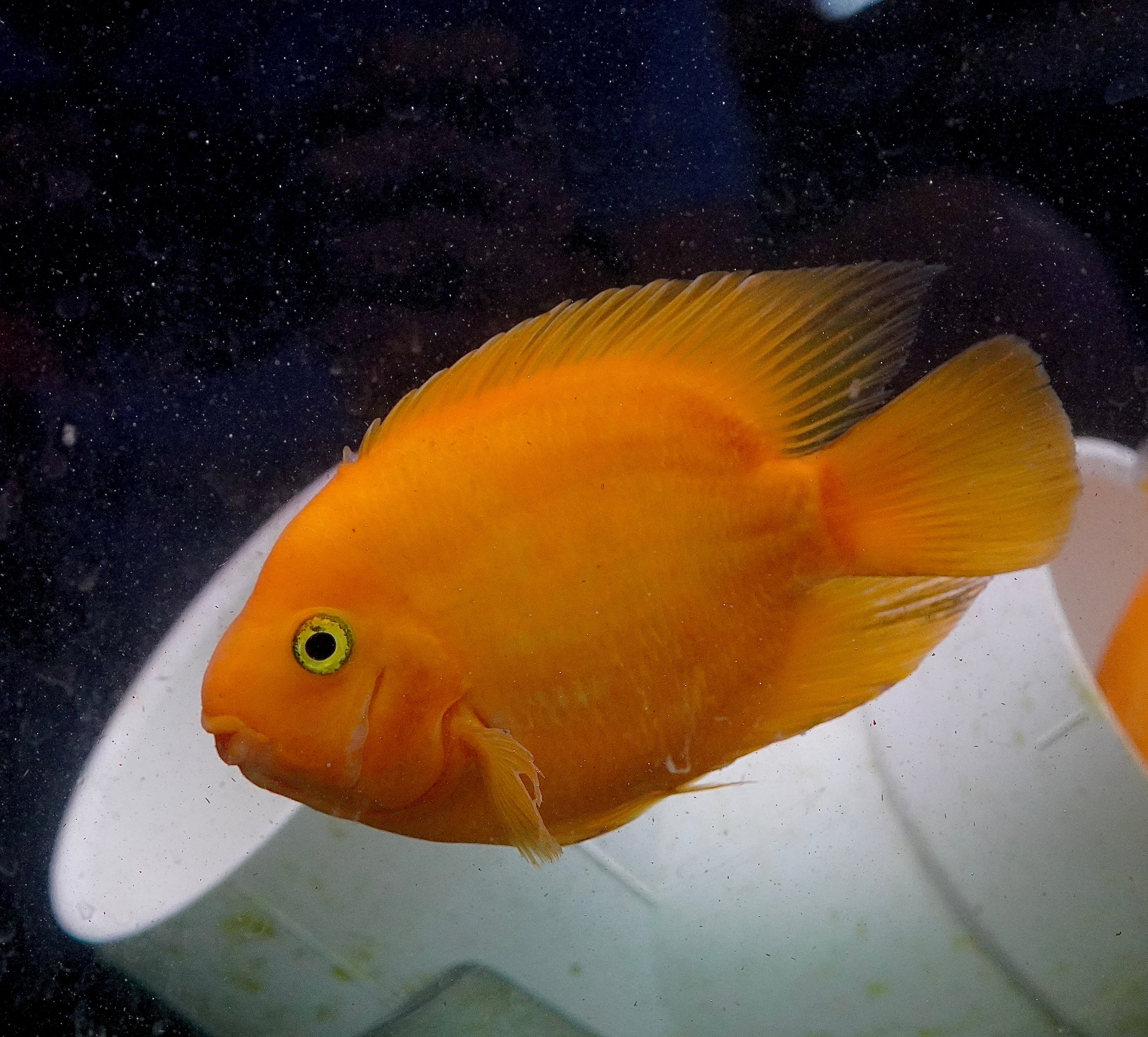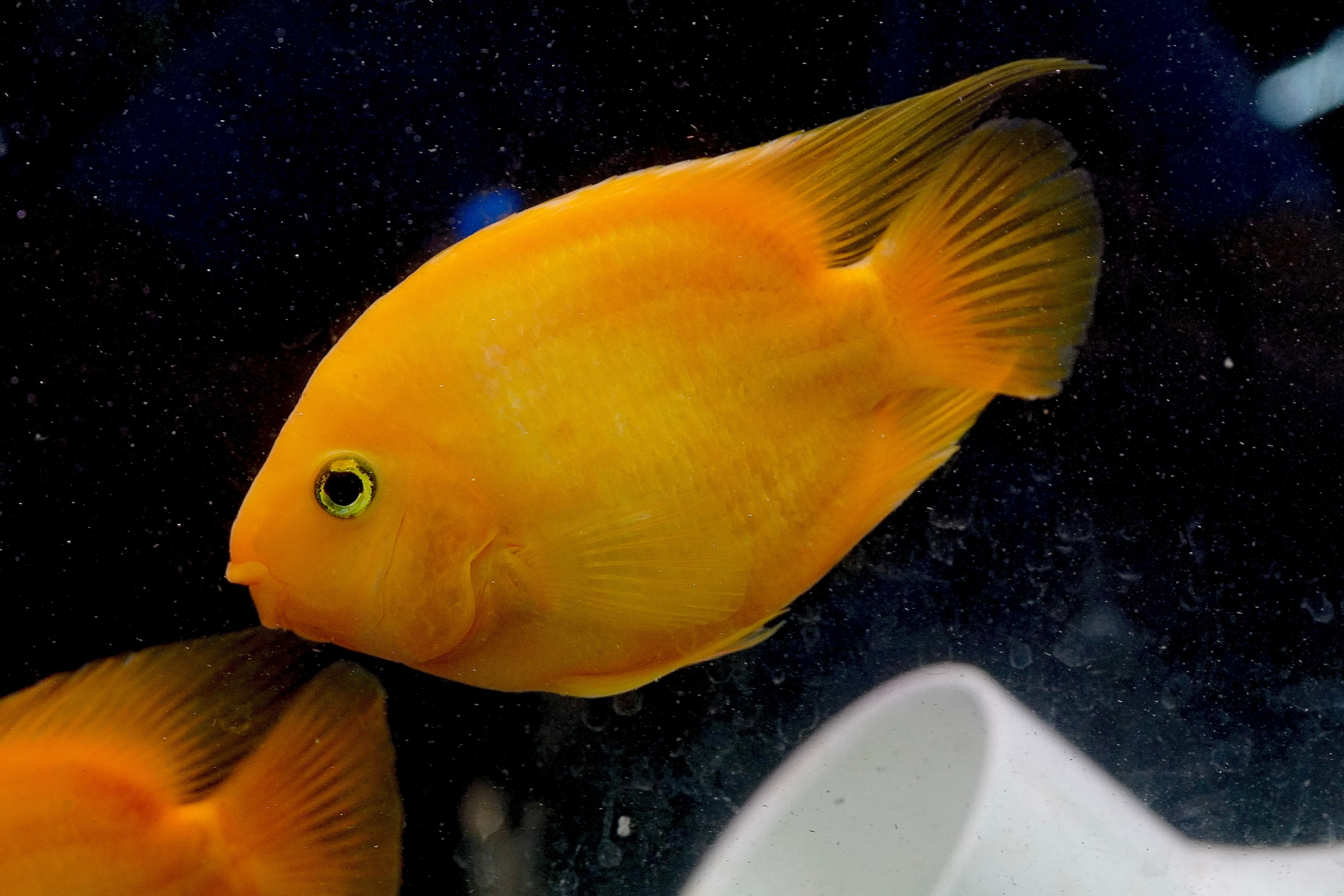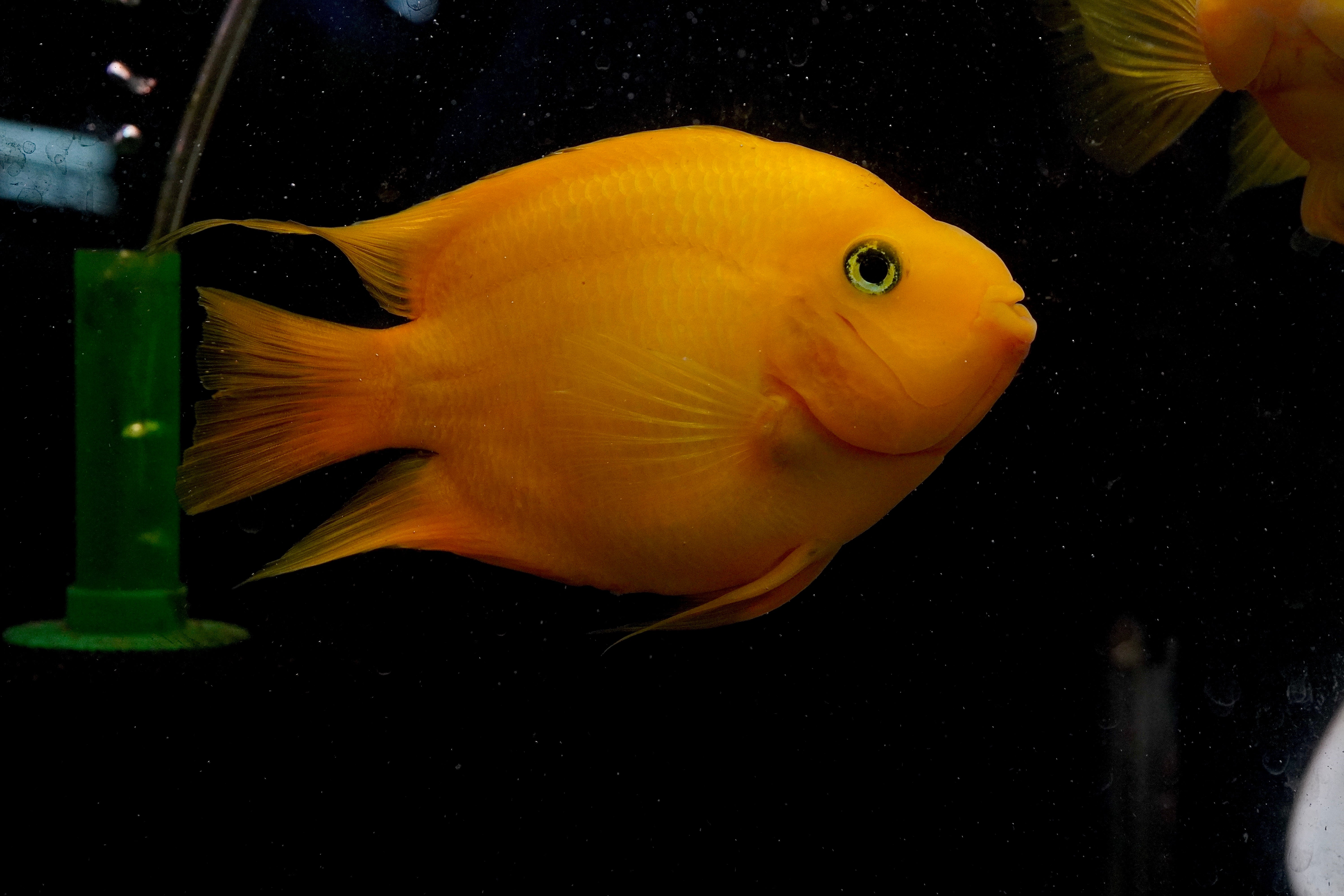 The Rare Golden Koi Parrot Fish (Panda) captivates with its unique white and yellow patterns. A hybrid cichlid, it thrives in tanks of 55 gallons or more. Known for its peaceful temperament, it pairs well with other community cichlids, creating a harmonious and colorful tank.