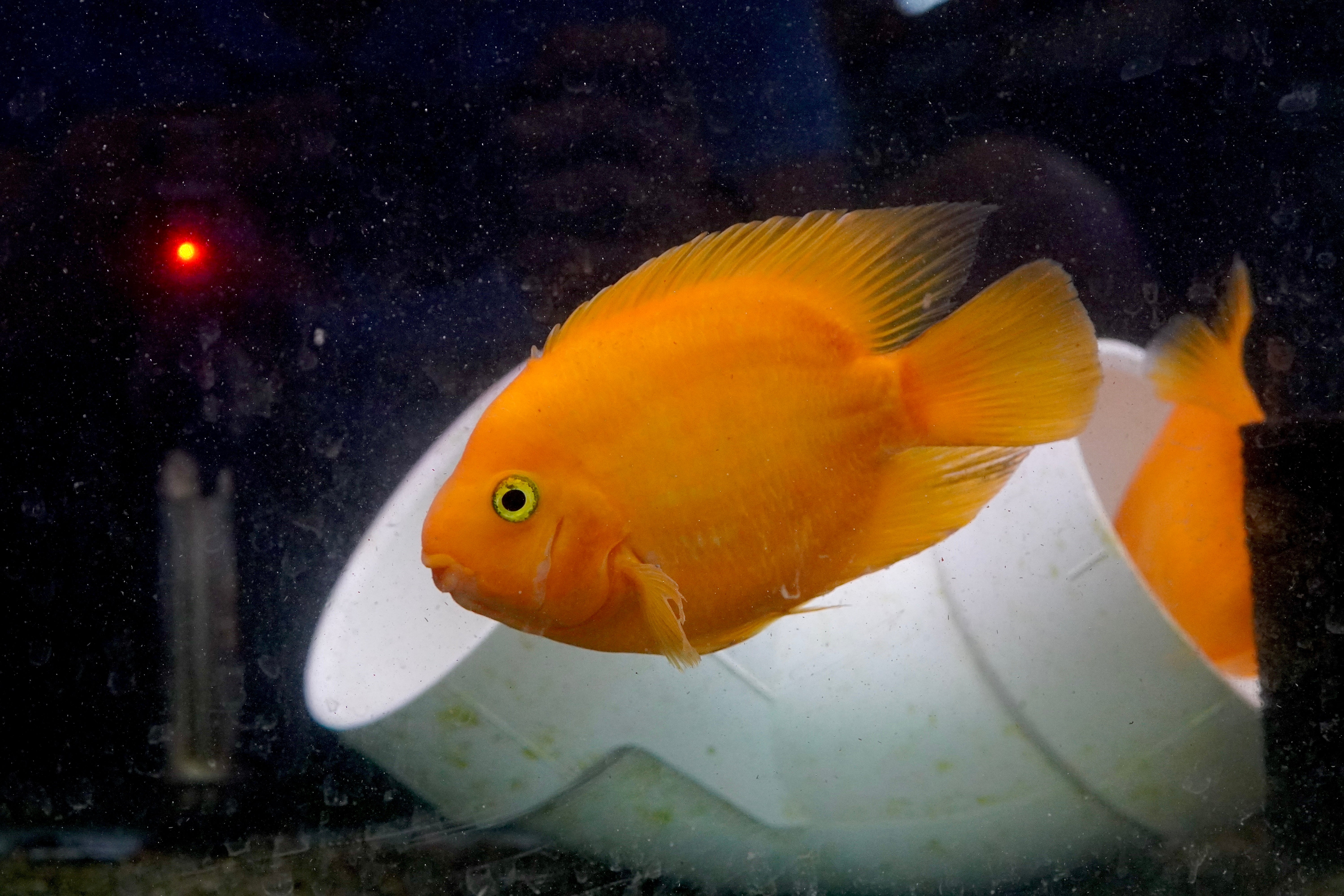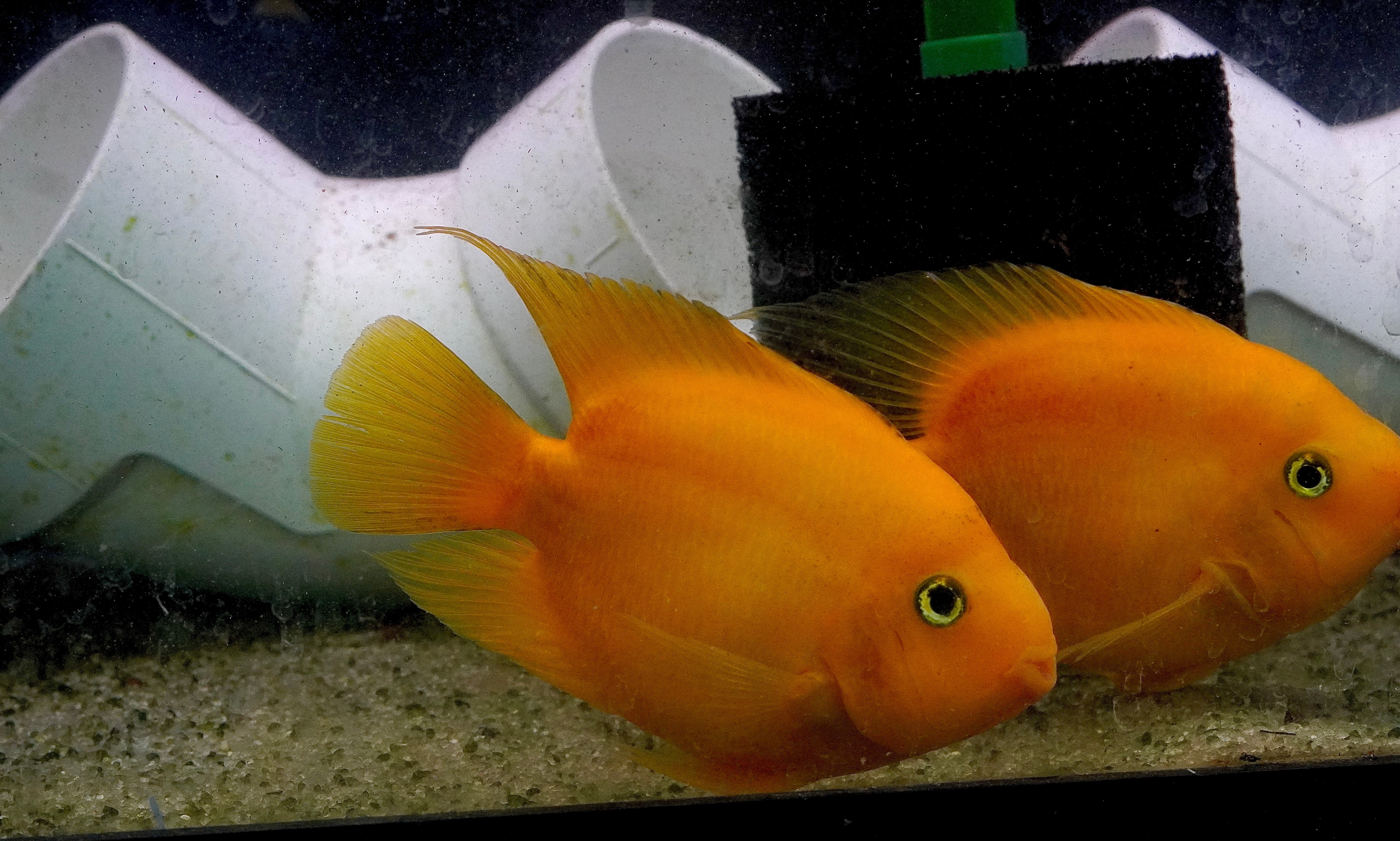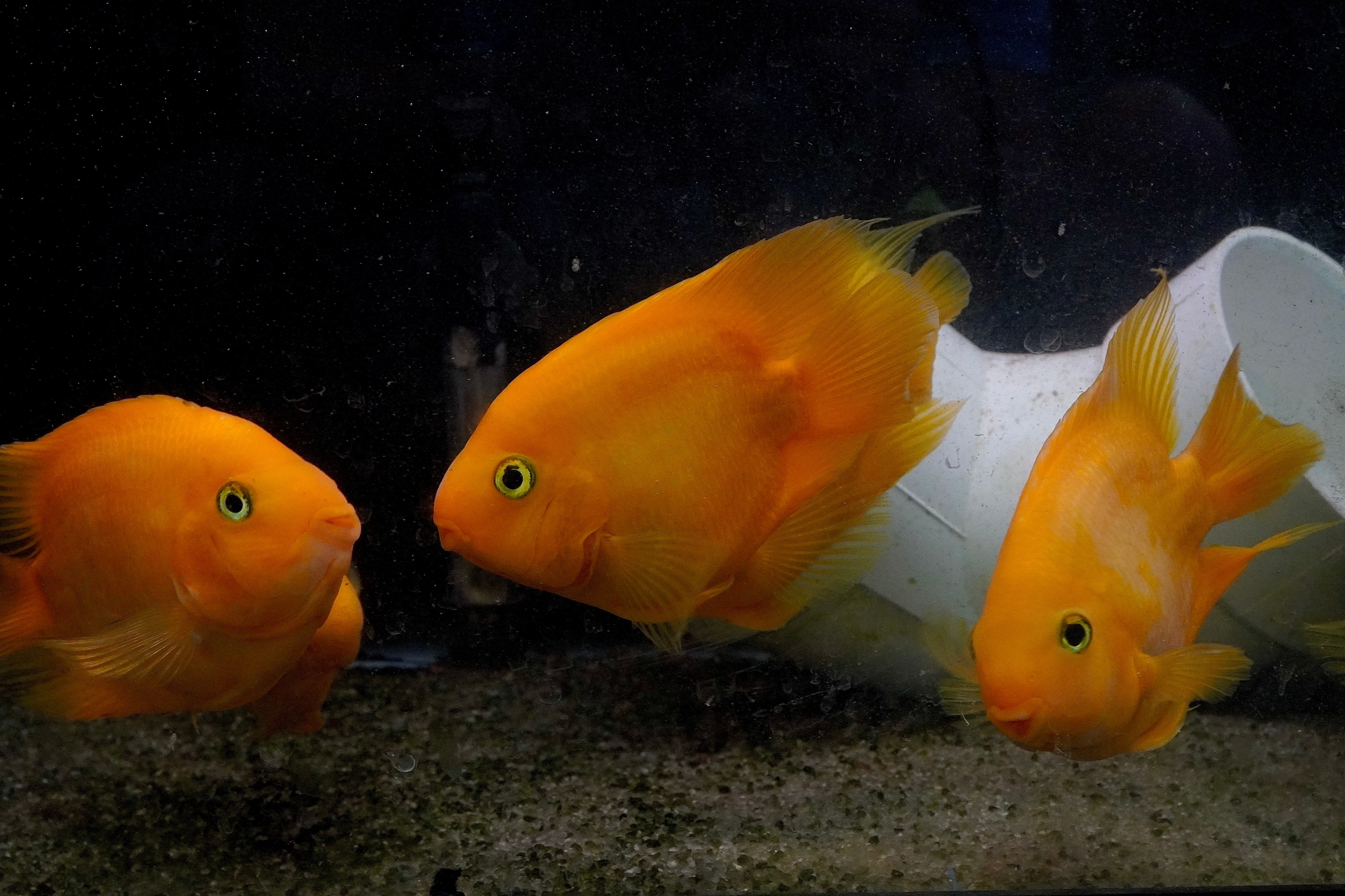 The Rare Golden Koi Parrot Fish (Panda) captivates with its unique white and yellow patterns. A hybrid cichlid, it thrives in tanks of 55 gallons or more. Known for its peaceful temperament, it pairs well with other community cichlids, creating a harmonious and colorful tank.